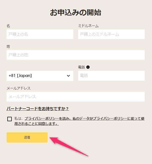 上から順に、「氏名」「電話番号」「メールアドレス」を入力し、最後に「送信」をクリックします。