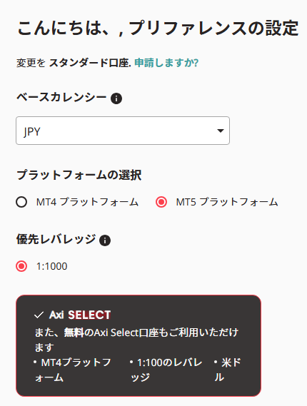 取引口座のベースカレンシー(基軸通貨)・プラットフォーム・レバレッジを選択します。