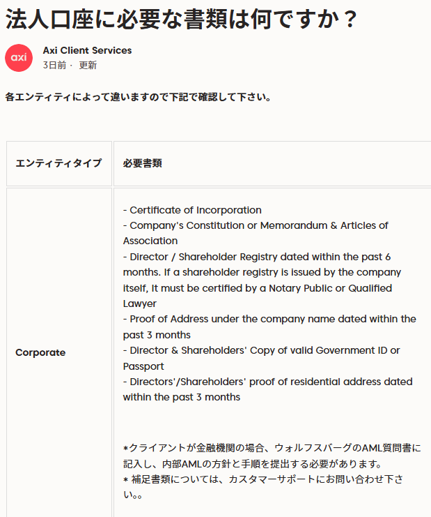 Axiサポートデスク(service@axi.com)へ法人口座開設の旨の連絡と下記の書類を提出後、承認されれば法人口座の開設は完了です。