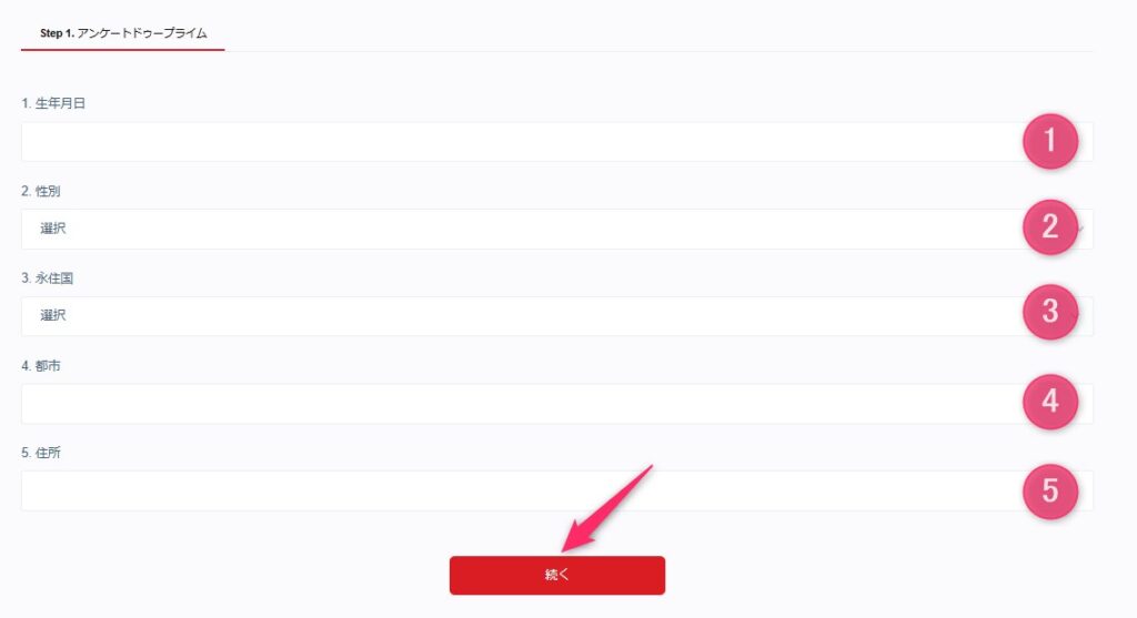 マイページにログイン後、個人情報の登録が案内されます。以下の項目を入力・選択し、「続く」をクリックしてください。