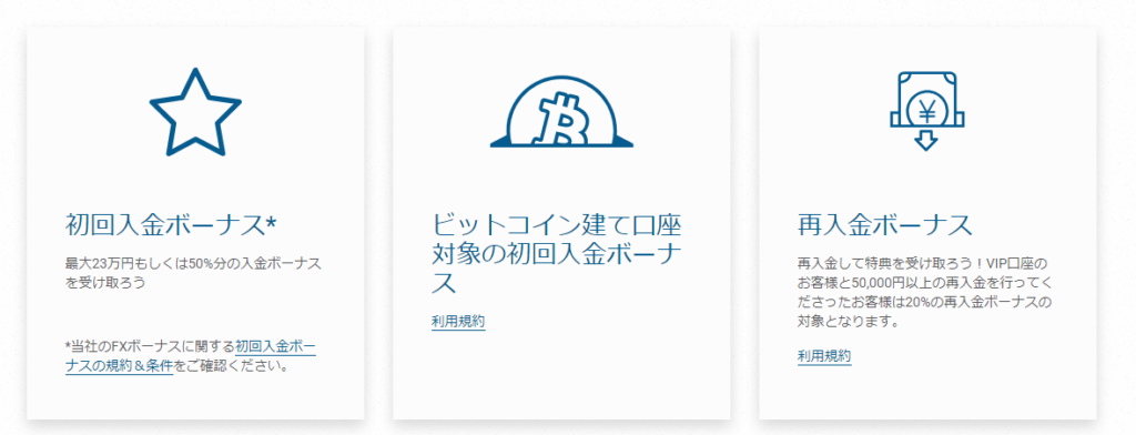 | 再入金ボーナス | 入金額の20%(50,000円以上の入金) |