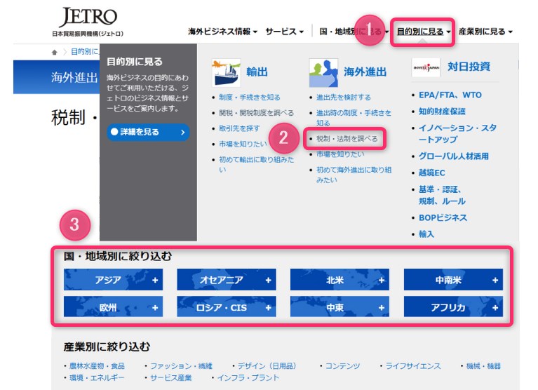 JETRO(日本貿易振興機構)では、海外在住者に役立つ各国の税制の基本情報がまとめられています。国・地域別の税制は以下の方法で調べることができます。