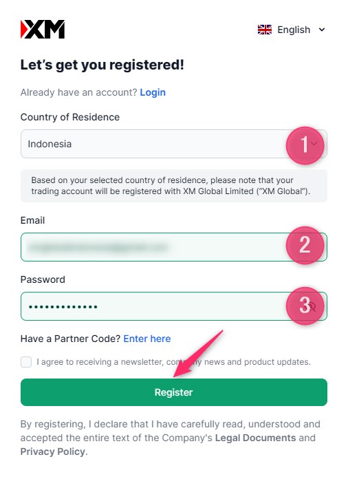 「Country of Residence(①)」で「Indonesia」を選択し、「メールアドレス(②)」とログイン用の「パスワード(③)」を入力して「Register」をクリックします。