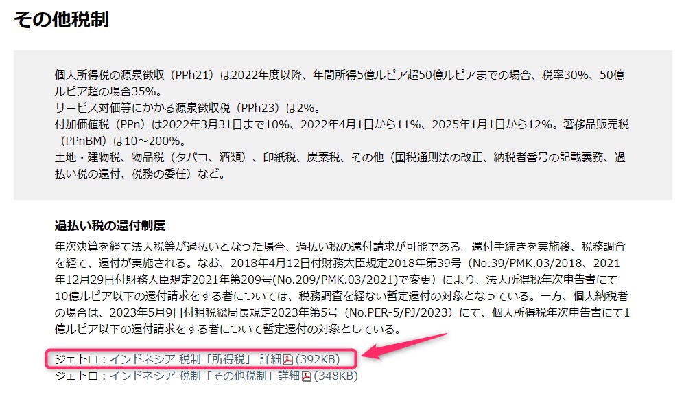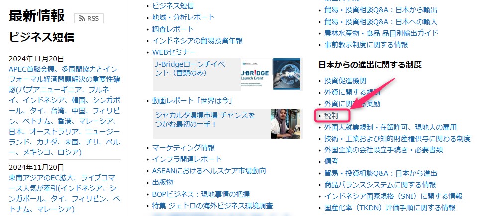 JETRO(日本貿易振興機構)は、海外在住者に役立つ各国の税制がまとめられています。インドネシアの税制を調べる方法は以下のとおりです。