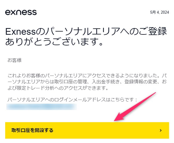 登録したメールアドレス宛てにExnessからメールが届くので、「取引口座を開設する」をクリックします。