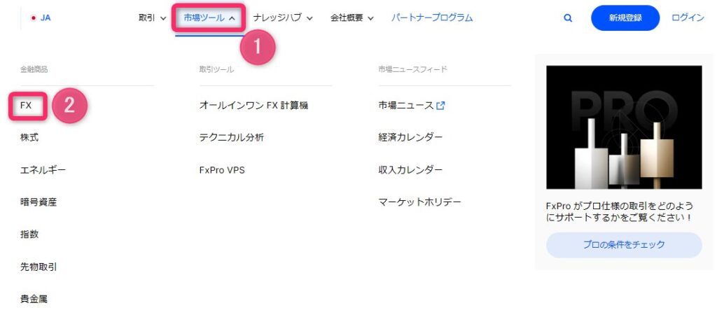 公式サイトのメニューにある「市場ツール(①)」をクリックし、「FX(②)」を選択します。