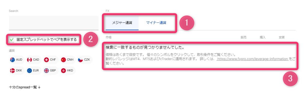 「メジャー通貨またはマイナー通貨(①)」を選択し、「固定スプレッドベットでペアを表示する(②)」にチェックを入れます。