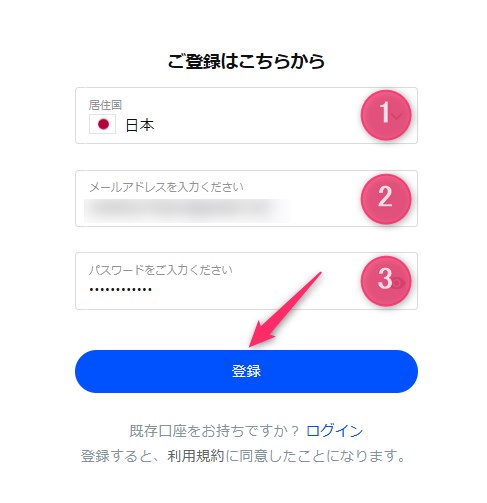 「居住国(①)」、「メールアドレス(②)」、「パスワード(③)」を入力し、「登録」をクリックします。