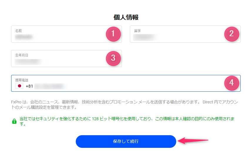「名前(①)」、「苗字(②)」、「生年月日(③)」、「携帯電話(④)」を入力し、「保存して続行」をクリックします。