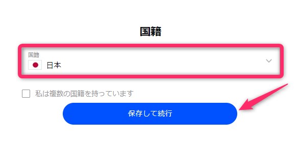 該当する国籍を選択し、「保存して続行」をクリックします。