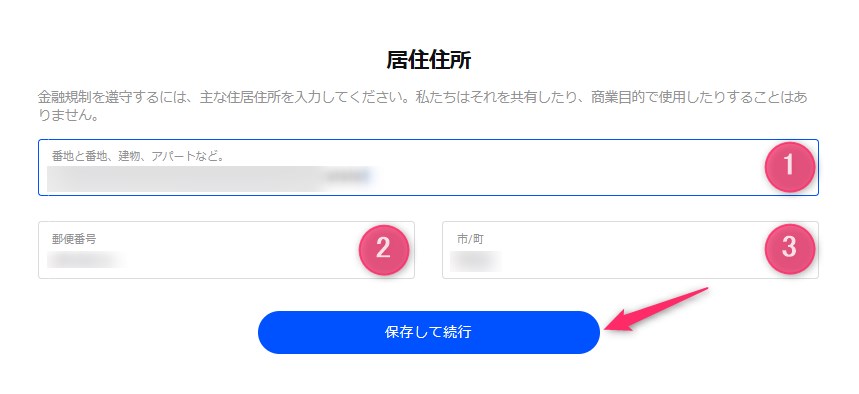 「住所(①)」、「郵便番号(②)」、「市/町(③)」を入力し、「保存して続行」をクリックします。