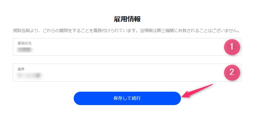 「雇用状況(①)」と「業界(②)」を選択し、「保存して続行」をクリックします。