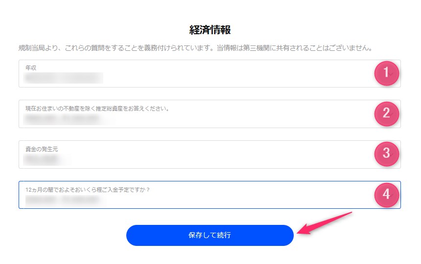 「年収(①)」、「推定総資産(②)」、「資金の発生元(③)」、「12ヶ月間の入金予定額(④)」を選択し、「保存して続行」をクリックします。