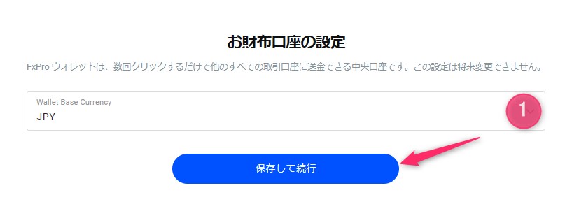 「Wallet base Currency(①)」で口座通貨を選択し、「保存して続行」をクリックします。