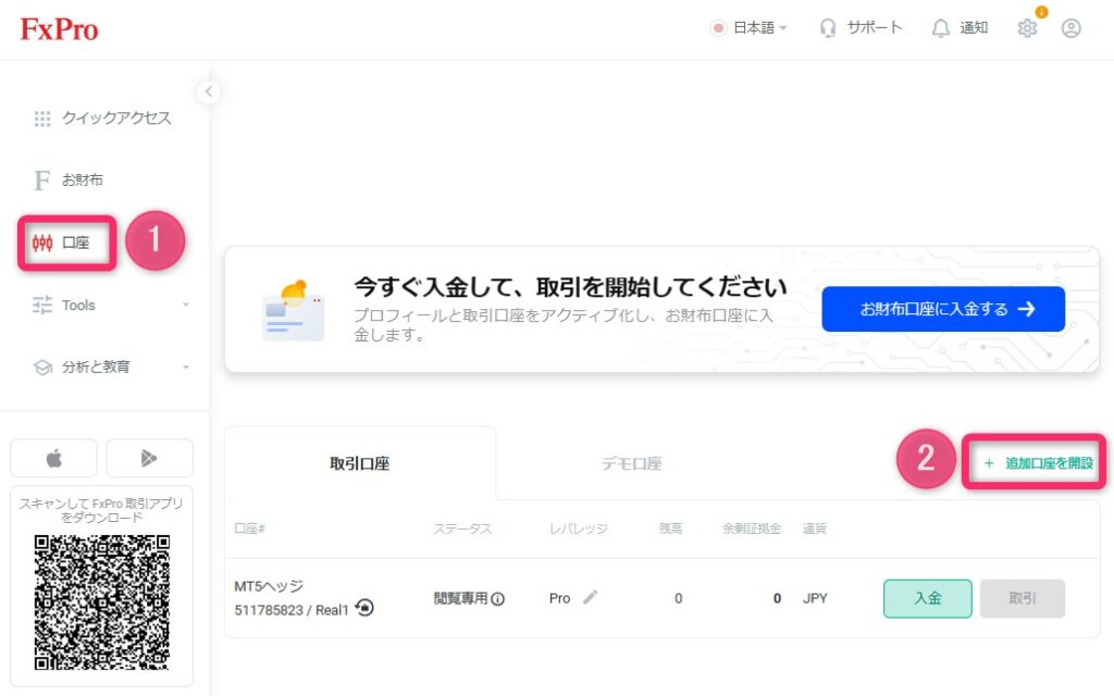 メニューにある「口座(①)」を選択し、「+追加口座を開設(②)」をクリックします。