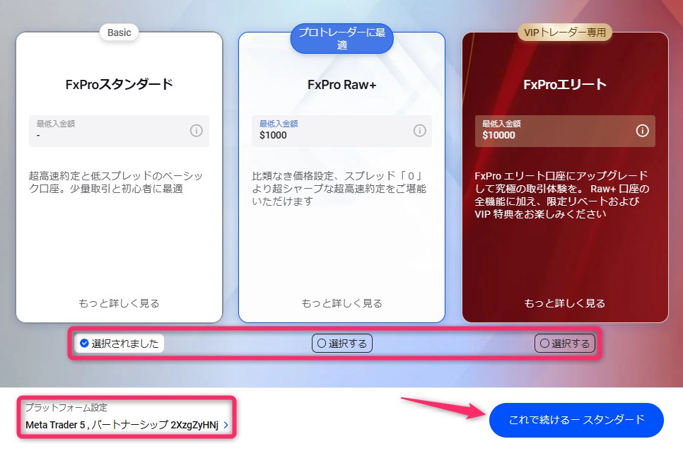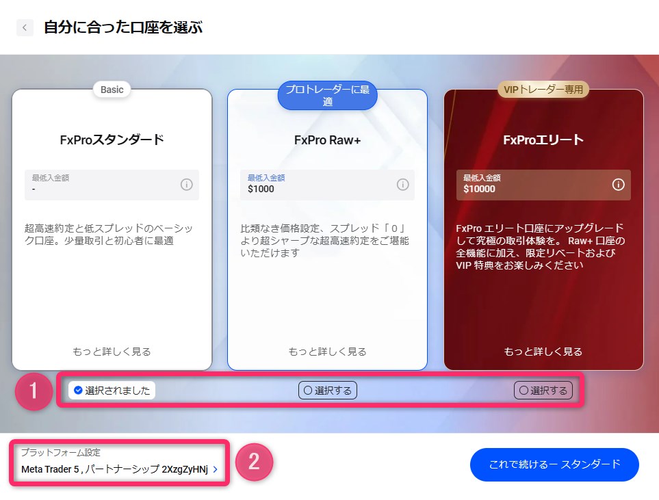 次に、「選択した口座タイプ(①)」と「プラットフォーム設定(②)」が正しいことを確認し、「これで続ける」をクリックします。