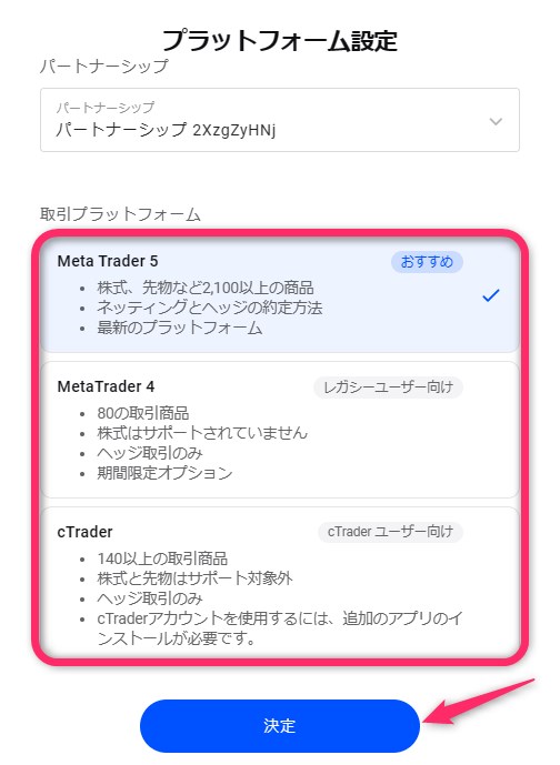 取引で使用するプラットフォームを「MT5」「MT4」「cTrader」から選び、「決定」をクリックします。