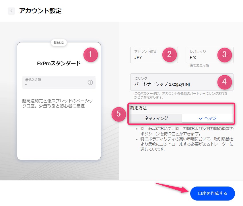 | ②アカウント通貨 | 残高や損益を表示する口座通貨を選択 |