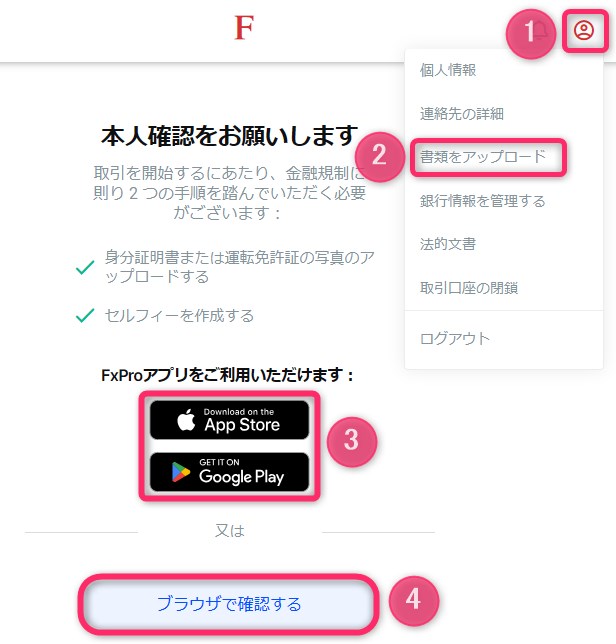 画面右上の「アイコン(①)」から「書類をアップロード(②)」を選択します。「FxProアプリ(③)」または「ブラウザで確認する(④)」を選択します。