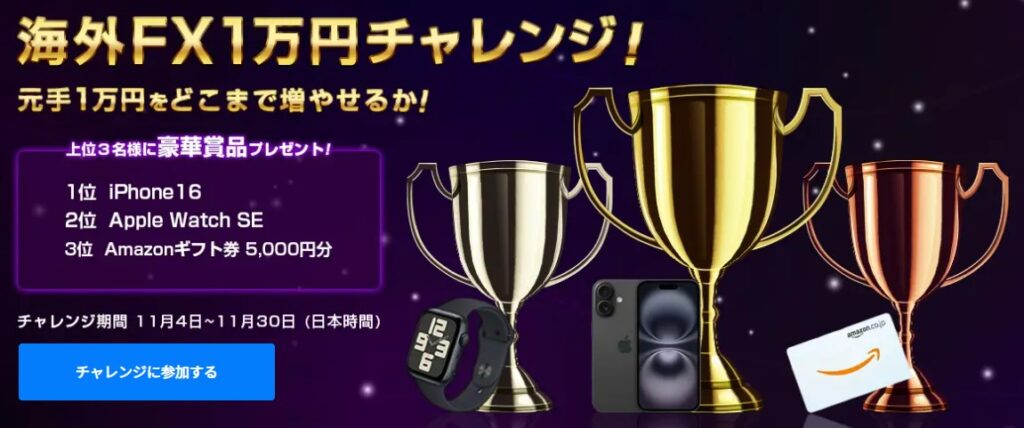 デモトレードコンテストは、仮想資金を使って取引成績を競います。海外FXでは実際に現金や賞品が獲得できるため、中上級者からも注目されるイベントです。