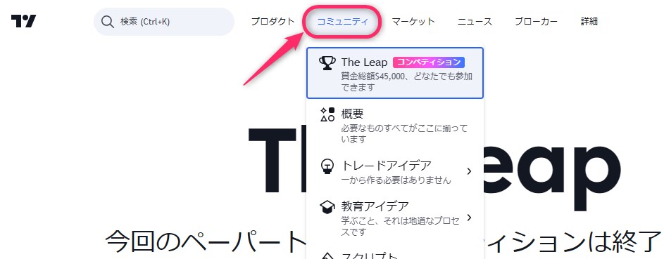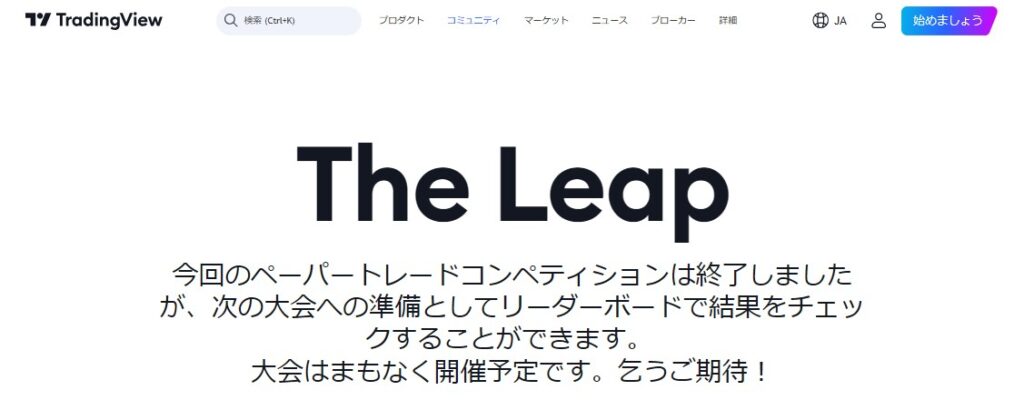 2024年10月17日現在、次回のトレードコンテストの開催は未定です。最新情報は、公式サイトのメニュー内にある「コミュニティ」から「The Leap」をクリックして確認できます。