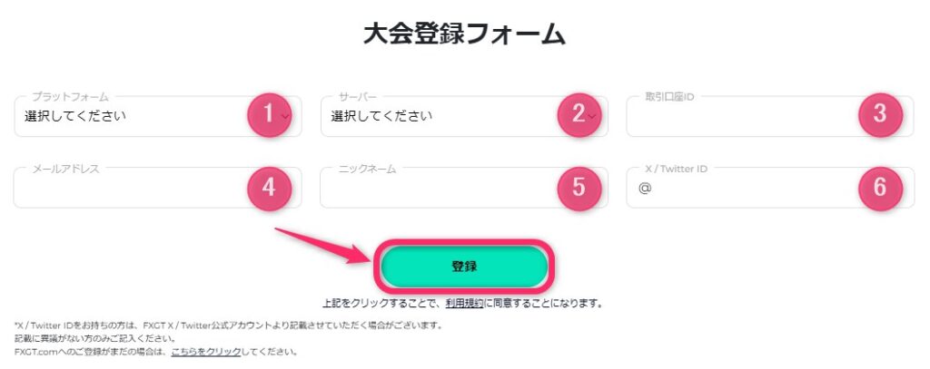 ウィークリー・トレード大会の公式ページにある「大会登録フォーム」に必要事項を入力し、「登録」をクリックします。