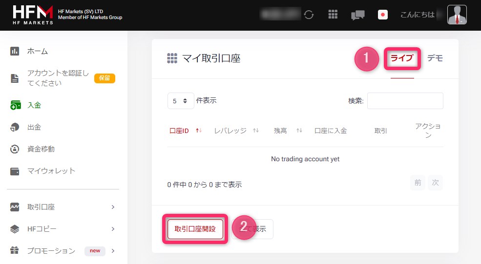 アカウント作成と同時にマイページが用意され、そこからスタンダード+口座を開設できます。詳しい手順は、口座開設方法の記事内「ステップ3:MT5口座(ライブ口座)の開設」でご確認ください。