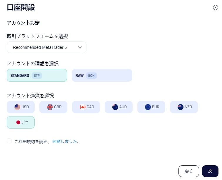 最後に、「アカウント通貨」では、普段使用するJPY(日本円)を選択すると便利です。 ここで設定した通貨が取引口座の基準通貨となり、入出金や損益表示の単位として適用されます。