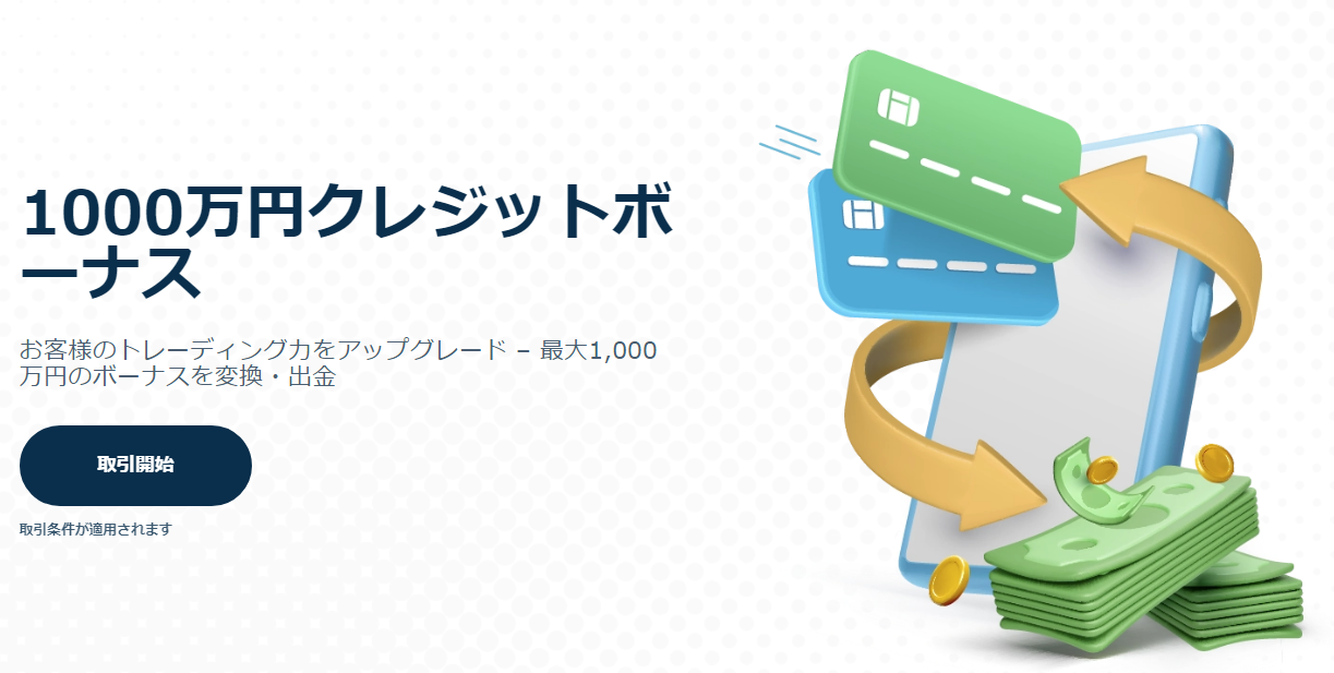 入金額と同額(100%)のボーナスクレジットを獲得できる入金ボーナスや取引量着応じてキャッシュバックを受け取れる2種類のキャンペーンを常時開催しています。