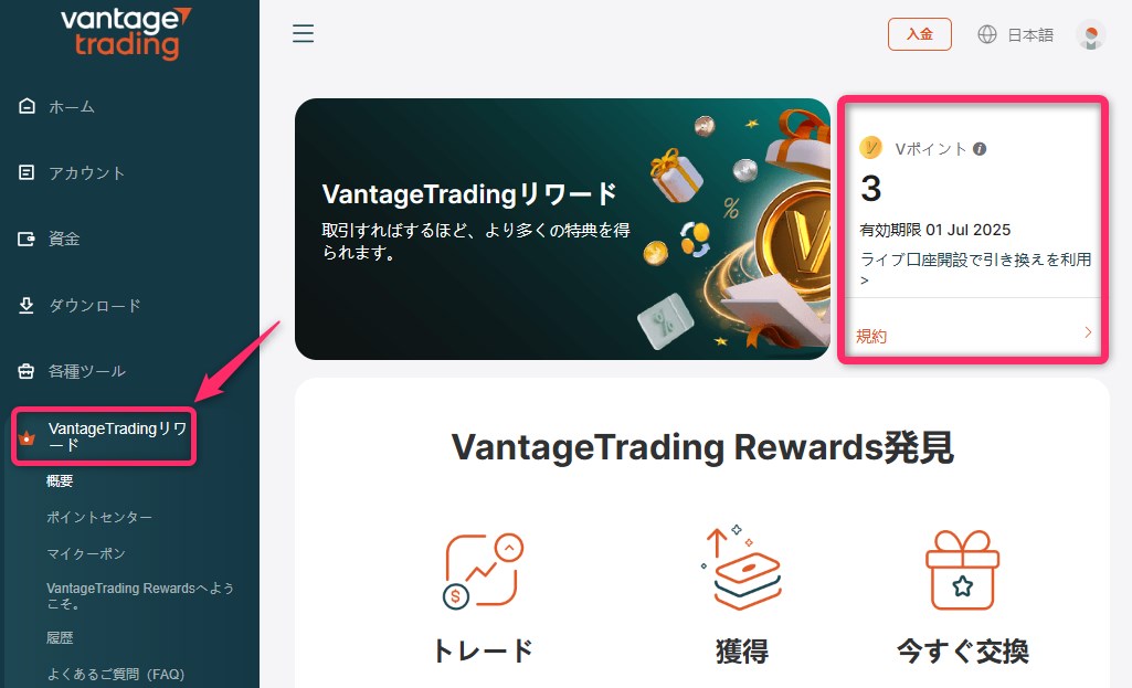 マイページの左側にある「Vantage Tradingリワード」をクリックします。会員ランクとVポイントの獲得数が表示されます。