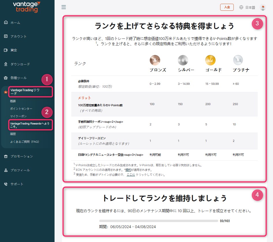 VantageTradingリワードのランクを維持する条件は?