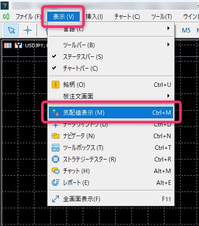 MT4/MT5の左上の「表示」をクリックし、「気配値表示」を選びます。