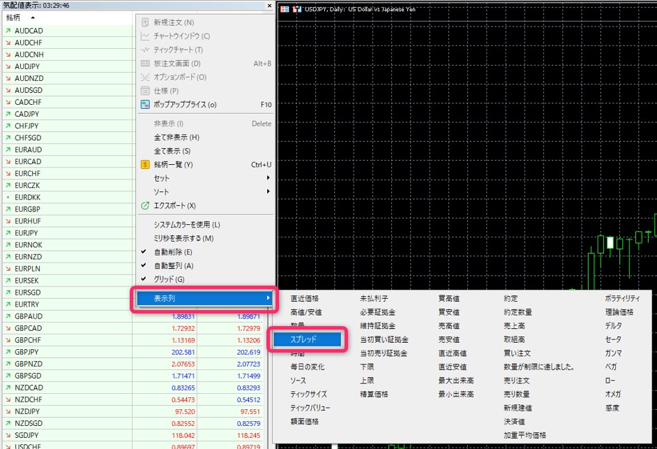 気配値が表示されたパネル上で右クリックし、「表示列」にカーソルを当てて「スプレッド」をクリックします(MT5の場合)。