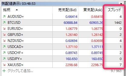 買気配(Ask)の右側にリアルタイムスプレッドが一覧表示されます。MT4/MT5ではポイント単位で表示されるため、10で割った数値がpips単位のスプレッドです。
