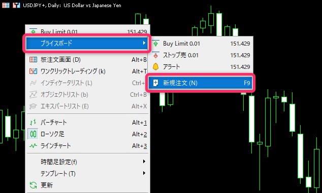 チャート上で右クリックし、「プライスボード」にカーソルを当てて表示された「新規注文」をクリックします(MT5の場合)。