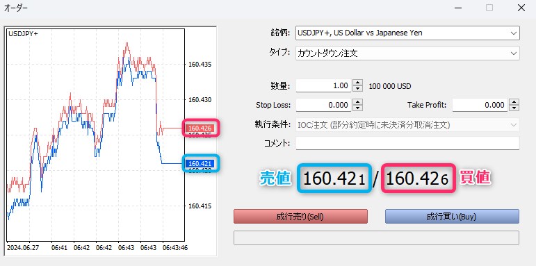新規注文パネルに表示されている買値と売値の差が、リアルタイムスプレッドです。