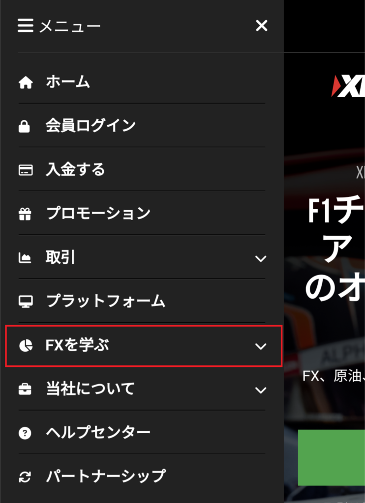 XMTrading公式サイトの画面上部にあるメニューの中の「FXを学ぶ」を選択します。