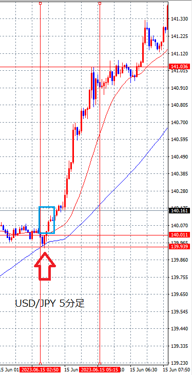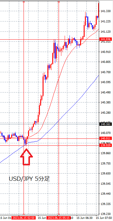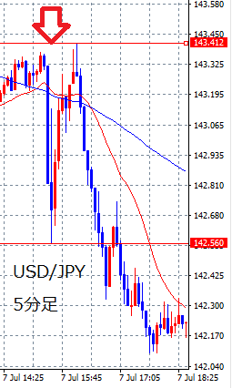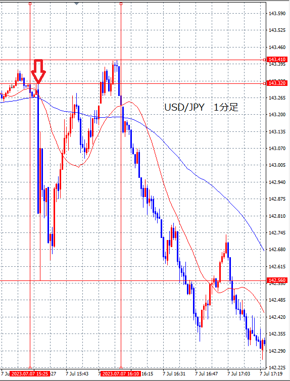 下の画像は2023年7月7日の雇用統計発表時のドル円(USD/JPY)の5分足チャートです。