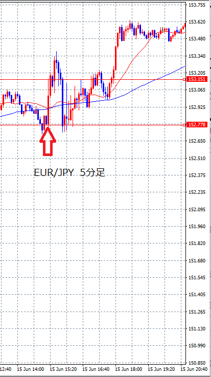結果の発表時には7pips程しかレートは変動していませんが、その後もしばらく上昇を続けています。