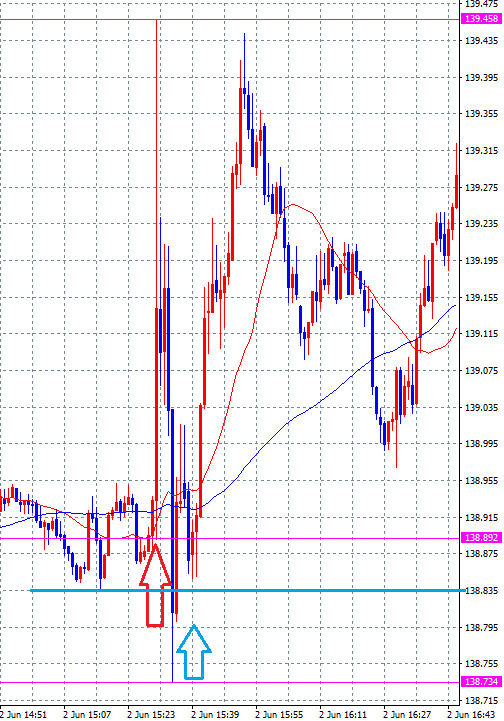 赤矢印の足が雇用統計発表時のローソク足ですが、1分間で139.458円まで一時的に急騰しその後138.734円まで急落してから再度上昇しています。