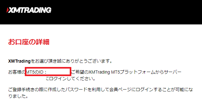 ログインID(MT4/MT5口座番号)は、口座開設後にXMTradingから届くメール「XMTradingへようこそ-お口座の詳細」の「MT4/MT5のID」に記載されています。