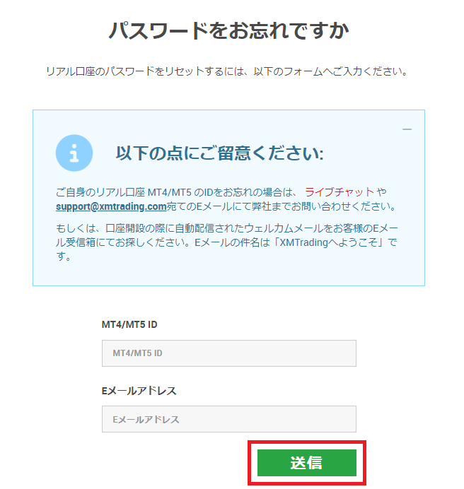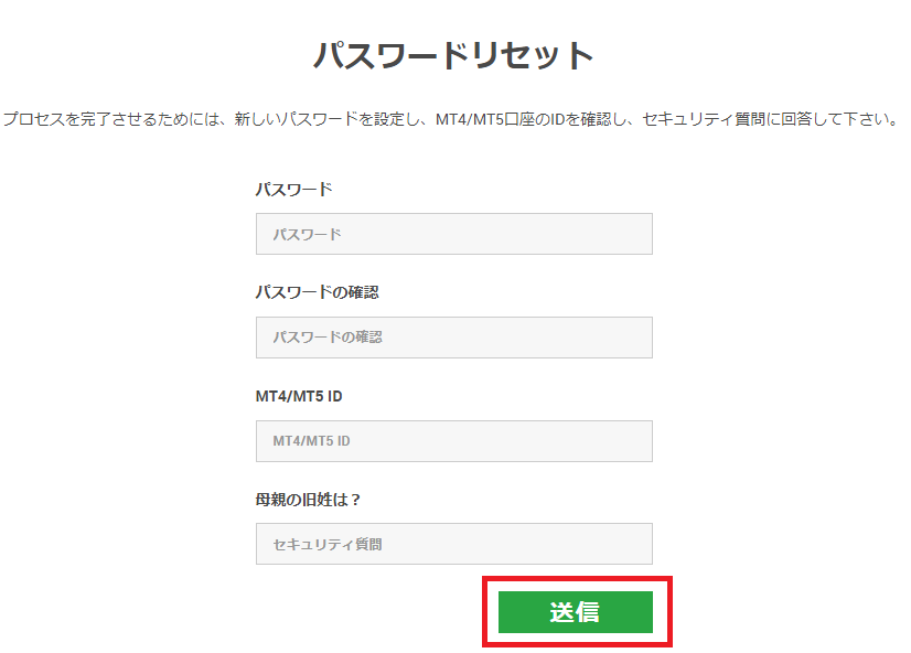| MT4/MT5 ID | パスワードをリセットするMT4/MT5のIDを入力します |