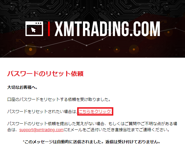 XMTradingから「パスワードリセット依頼」という件名のメールが届くので、本文内の「こちらをクリック」を選択します。