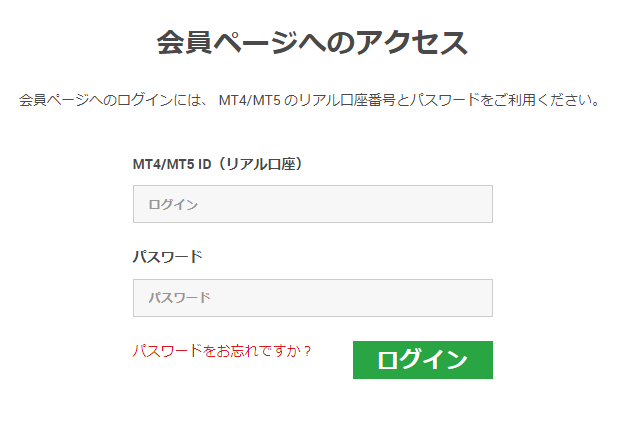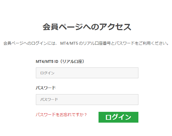 会員ログインフォームが表示されたら「MT4/MT5ID」と「パスワード」を入力して「送信」を選択すれば完了です。