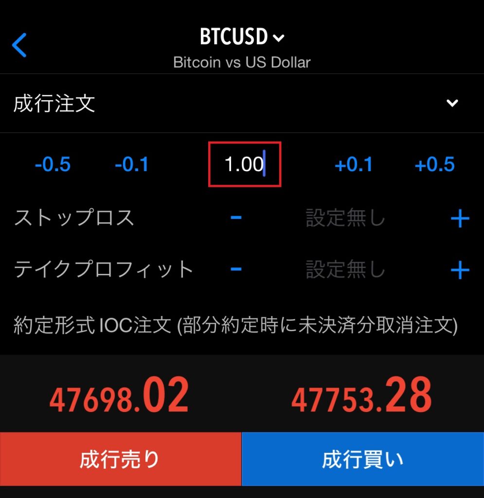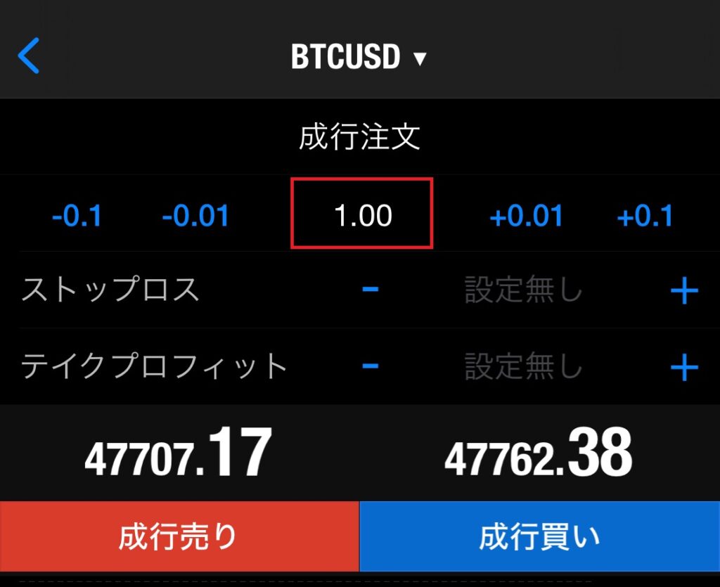 赤枠で囲まれている部分が、エントリーするロット数で「1.00=1ロット」になります。