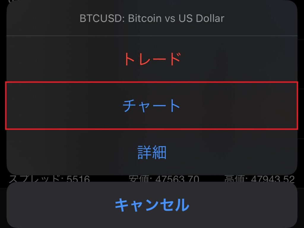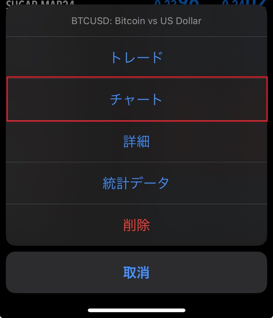 ※取引銘柄を選択後、「チャート」>画面上部の「トレード」をタップからでも注文フォームを表示できます。
