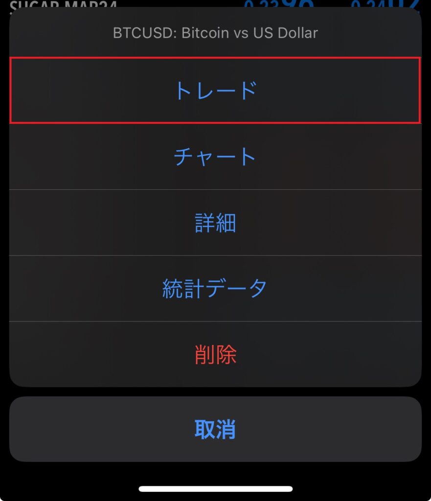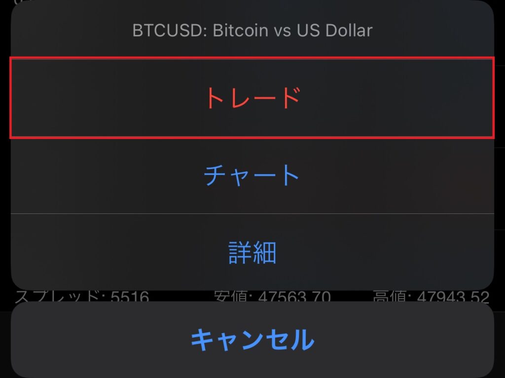 銘柄をタップすると下記のメニュー画面が表示されるので、「トレード」を選択します。