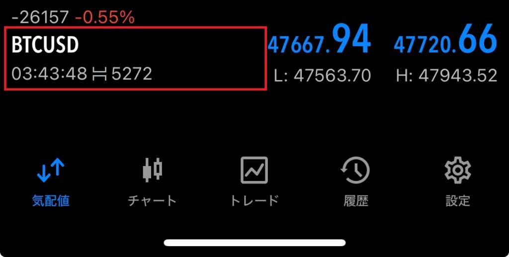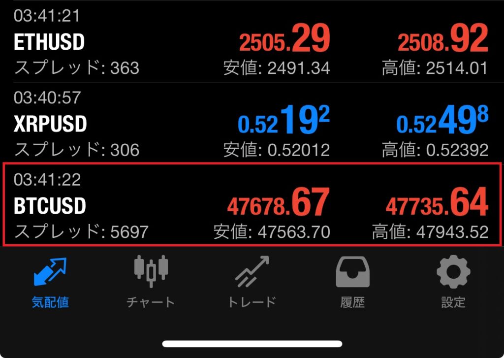スマホ版MT5を起動させると気配値一覧が表示されるので、取引したい銘柄をタップします。